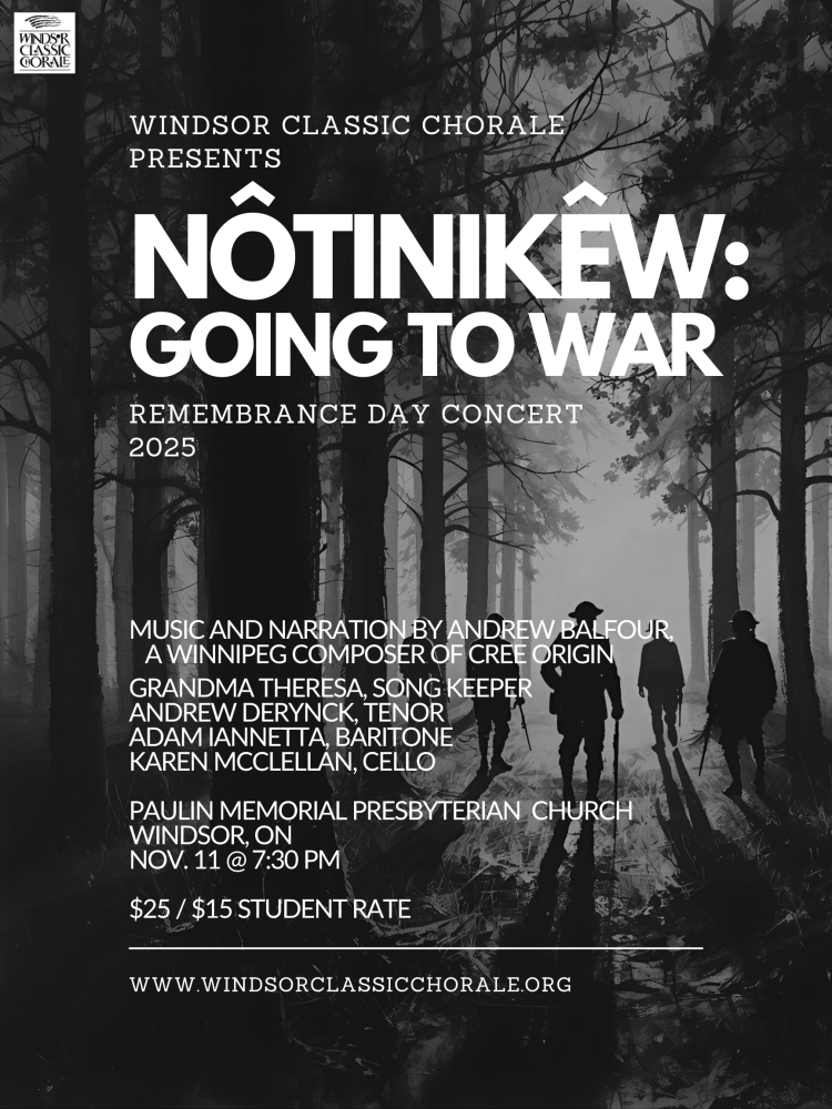 The Windsor Classic Chorale has a longstanding tradition of presenting a concert every November to honour those who gave their lives during the First and Second World Wars so that we might live in freedom today. This year, the WCC is proud to present a program commemorating these sacrifices in song with such works as Nôtinikêw: Going to War by Andrew Balfour.